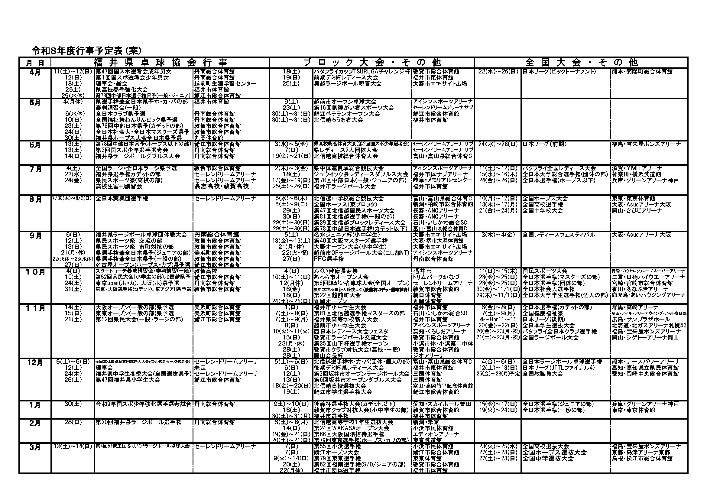 令和8年度福井県卓球協会行事予定表(R8.4.10現在)